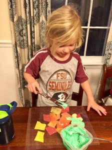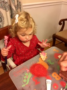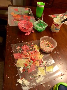 Then it came time to decorate the cookies. And it went just as you expect with two children under four. Frosting was everywhere: on the tabletop, on clothing, and especially on the girls’ cheeks after they licked their sugary fingers clean.