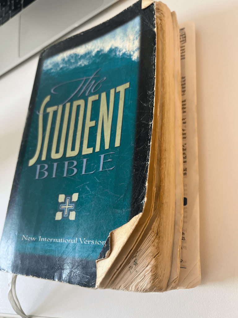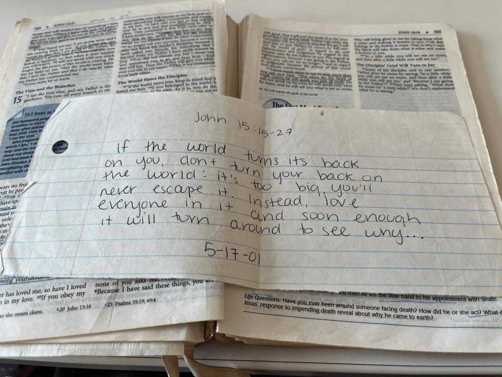 Then I stumbled upon the Bible of my youth, with its loose pages and underlines and notes from friends tucked in between parables and miracles and blessings.